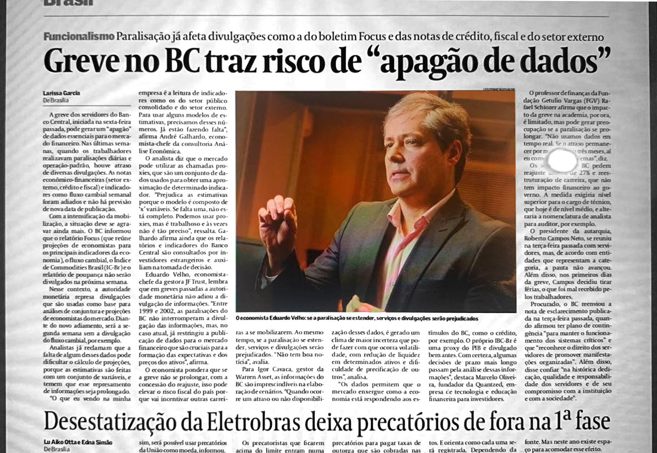 05/04/2022 - Valor EconômicoEntrevista de hoje(04 de abril) da JF Trust no Jornal Valor Econômico, sobre os impactos da greve dos funcionários do Bacen no mercado financeiro. No período do Plano Real, durante 1994-1998, inúmeros indicadores para o mercado financeiro eram divulgados com defasagem pelo Bacen, sendo que a decomposição de alguns não eram divulgados. Naquela época, tinha a proliferação dos consultores do mercado , mas com pouca informação e não existiam casas de análise como de hoje. Isso mudou em 1999, com adoção do regime de metas de inflação, e portanto, sem divulgação de dados financeiros e econômicos, o reflexo não desgasta a imagem somente da instituição, mas repercute nas posições dos ativos das instituições (juros, dólar, bolsa etc) como na qualidade do serviços de análise e projeções , mas tudo dependerá do tempo dessa greve. Avalio que o sistema de pagamentos não deverá ser interrompido.