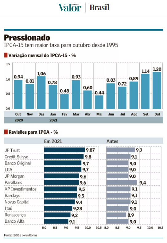 Twitter E-mail No Valor Econômico, JF Trus revê previsão da inflação de 2021 de 9,3% para 9,87%. 27/10/2021 - Valor Econômico