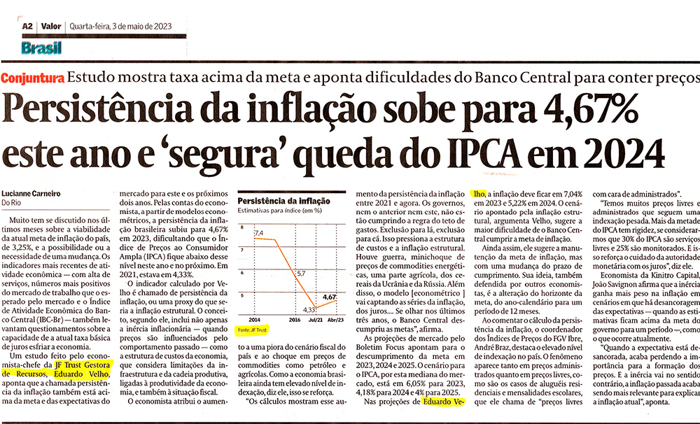 Um estudo feito gelo economista- chefe da JF Trust Gestora de Recursos, Eduardo Velho, aponta que a chamada persistência da inflação também está acima da meta e das expectativas do mercado para este e os próximos dois anos. Pelas contas do economista, a partir de modelos econométricos, a persistência da inflação brasileira subiu para 4,67% em 2023, dificultando que o índice de Preços ao Consumidor Ampla (lPCA) fique abaixo desse nível neste ano e no próximo. Em 2021, estava em 4,33%.