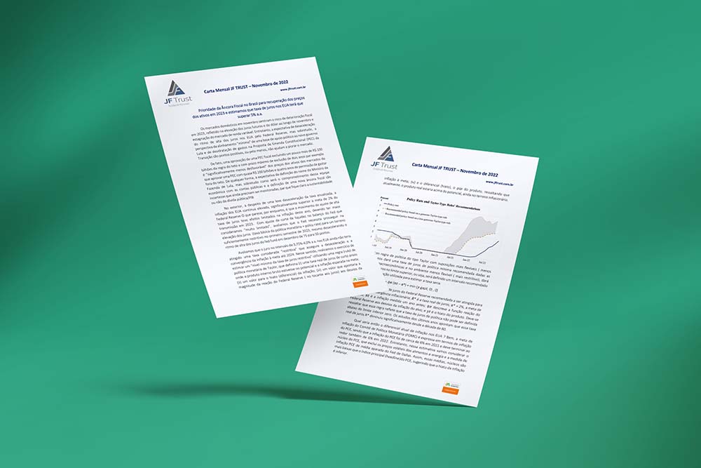 Os mercados domésticos em novembro sentiram o risco de deterioração fiscal em 2023, refletido na elevação dos juros futuros e do dólar ao longo de novembro e estagnação do mercado de renda variável. Entretanto, a expectativa de desaceleração do ritmo de alta dos juros nos EUA pelo Federal Reserve, mas sobretudo, a perspectiva de alinhamento “mínimo” de uma base de apoio político ao novo governo Lula e de desidratação de gastos na Proposta de Emenda Constitucional (PEC) da Transição são pontos positivos, ou pelo menos, não ajudam a piorar o mercado.